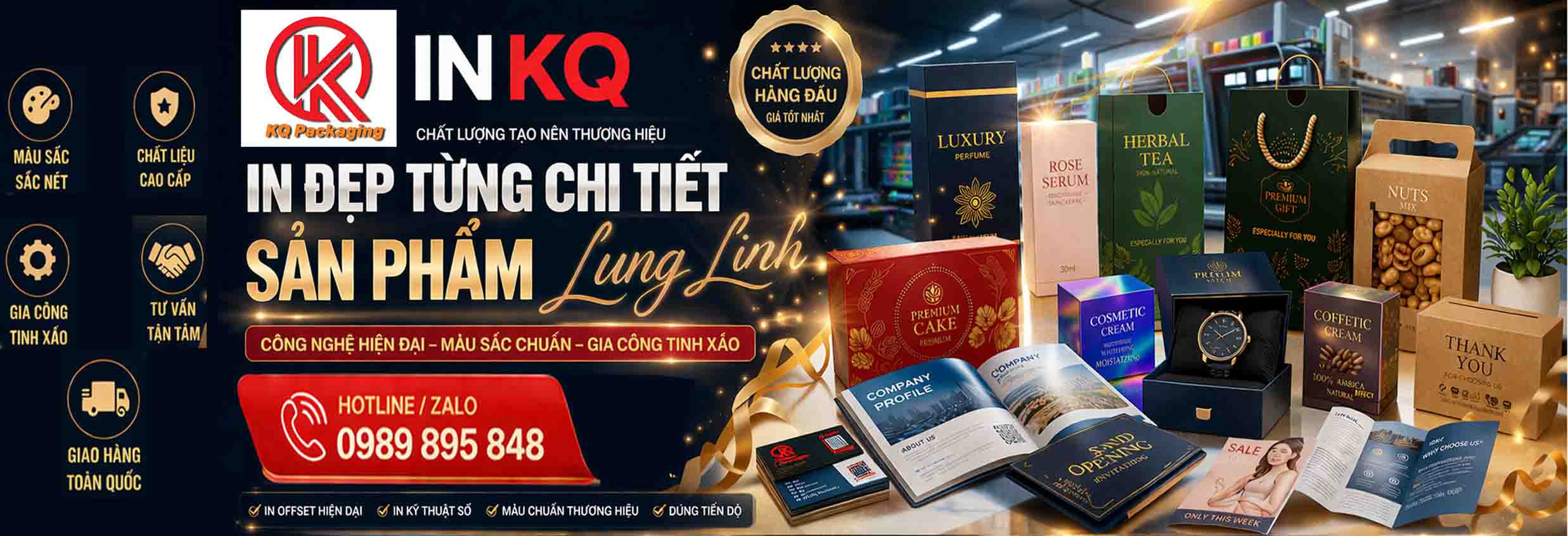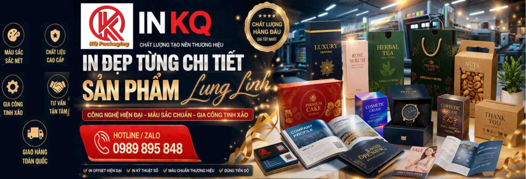 In Kiên Quỳnh là đơn vị chuyên thiết kế và sản xuất các sản phẩm in ấn chất lượng cao, cung cấp giải pháp in ấn chuyên nghiệp. Với hệ thống máy in hiện đại, công nghệ offset và kỹ thuật số tiên tiến, sản phẩm luôn sắc nét, màu chuẩn, gia công tinh xảo, giúp nâng tầm hình ảnh doanh nghiệp. In Kiên Quỳnh chuyên sâu bao bì vỏ hộp như hộp mỹ phẩm, thực phẩm, quà tặng, dược phẩm, hộp công nghệ và carton vận chuyển, thiết kế theo yêu cầu, kết hợp các kỹ thuật cao cấp như cán mờ, ép kim, dập nổi, phủ UV… tạo nên sản phẩm chắc chắn, sang trọng và tăng giá trị trưng bày. In Kiên Quỳnh nhận thiết kế, sản xuất và cung cấp sản phẩm in trên toàn quốc, hỗ trợ thiết kế miễn phí, giá hợp lý, thời gian nhanh